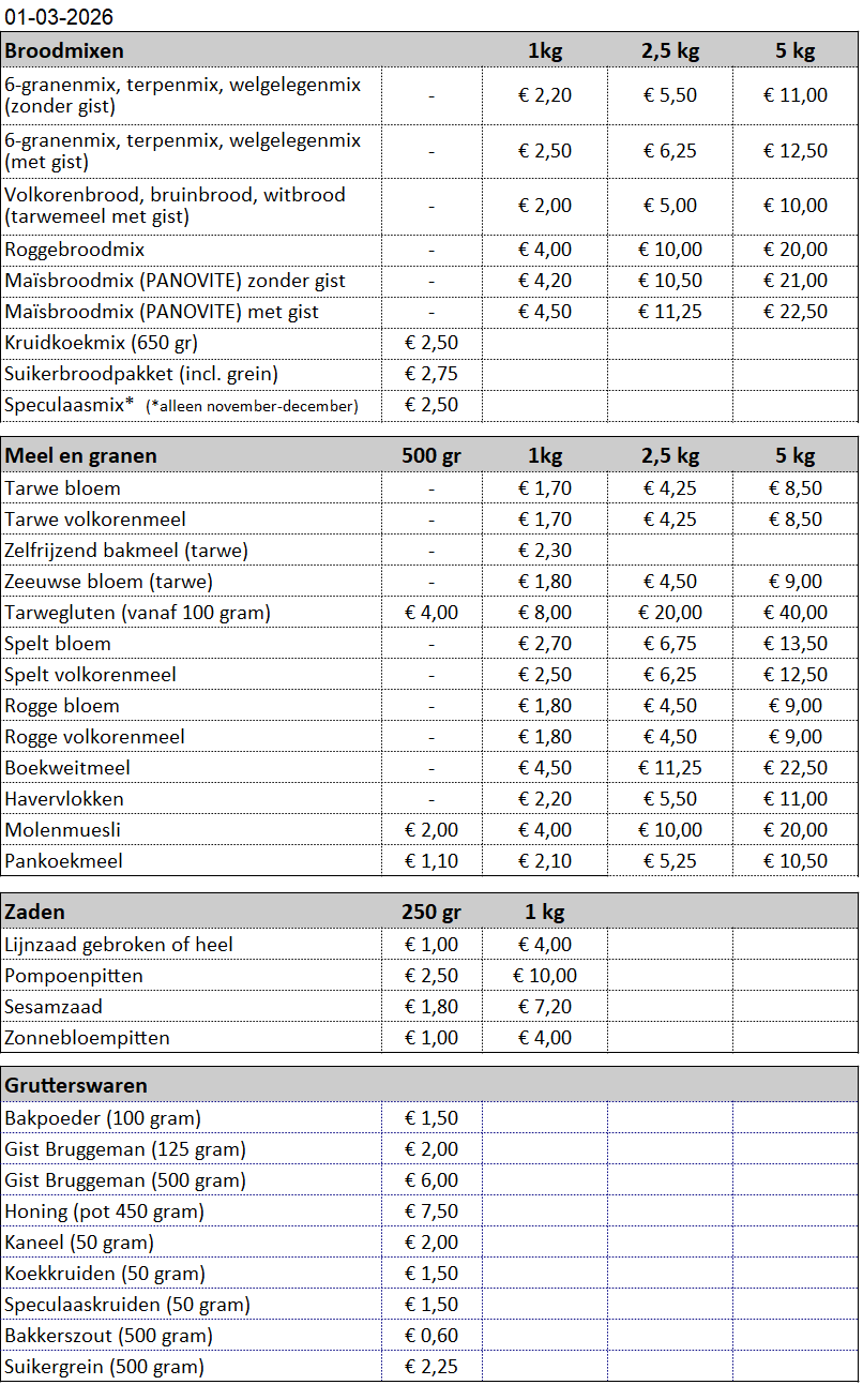 Prijslijst vanaf 1 maart 2026